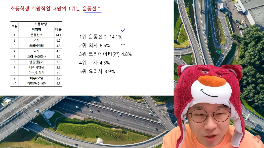 1위 운동선수 2위 의사 3위 크리에이터 4위 교사 5위 요리사.