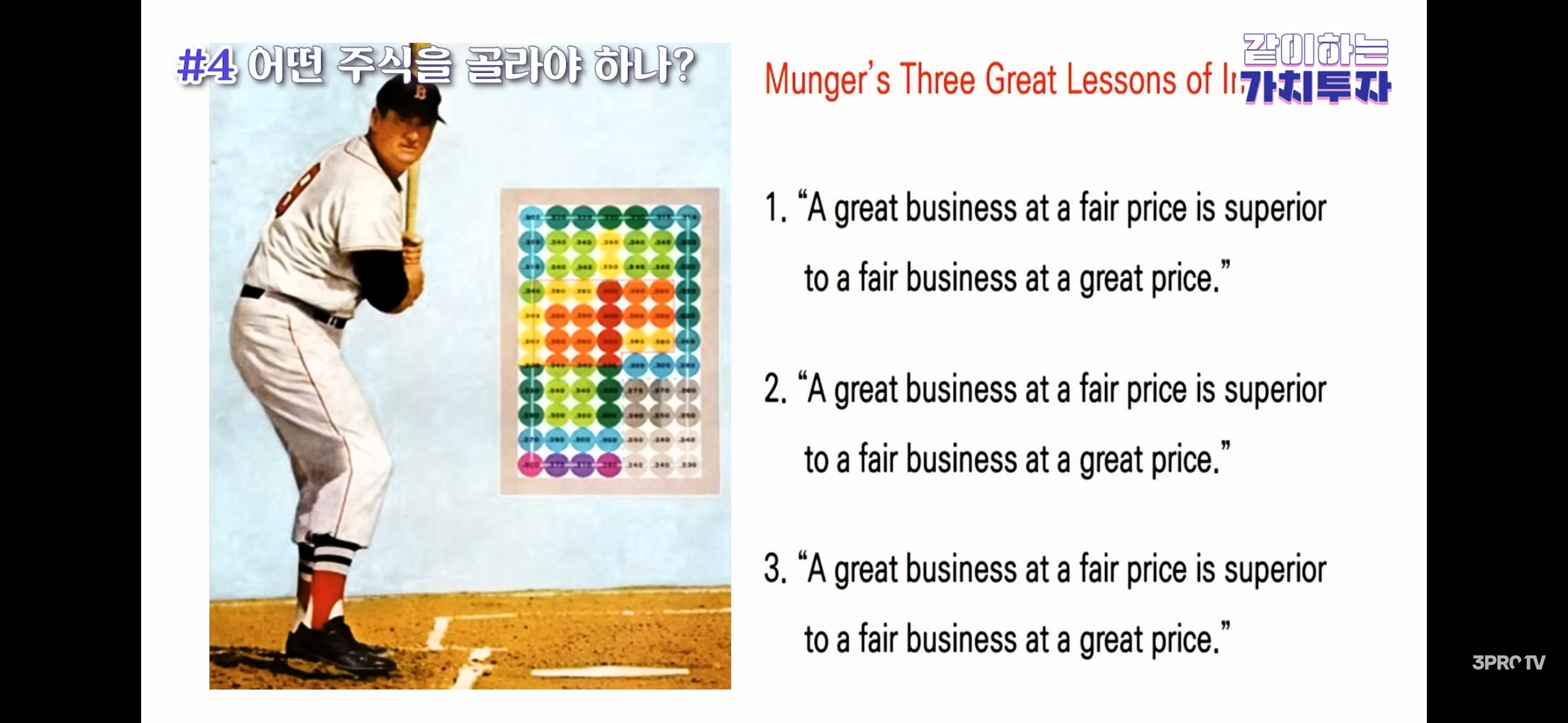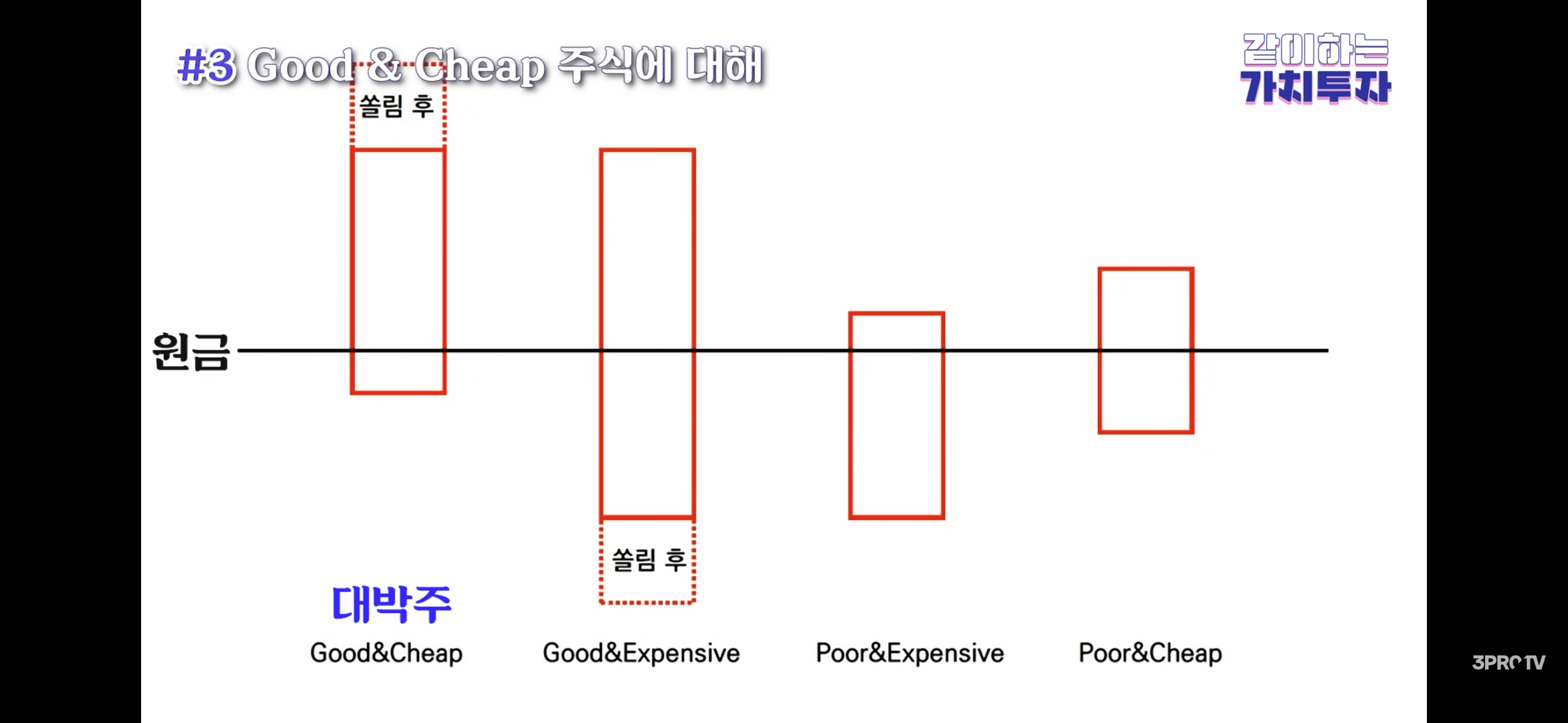 - 개인에게 권장하는 기본 필터는 “PBR 0.5배 이하 + ROE 15% 이상 + 경제적 해자”이고, 이런 주식은 단기 변동성을 감수하면 장기적으로 돈을 잃기 어렵다고 말한다.