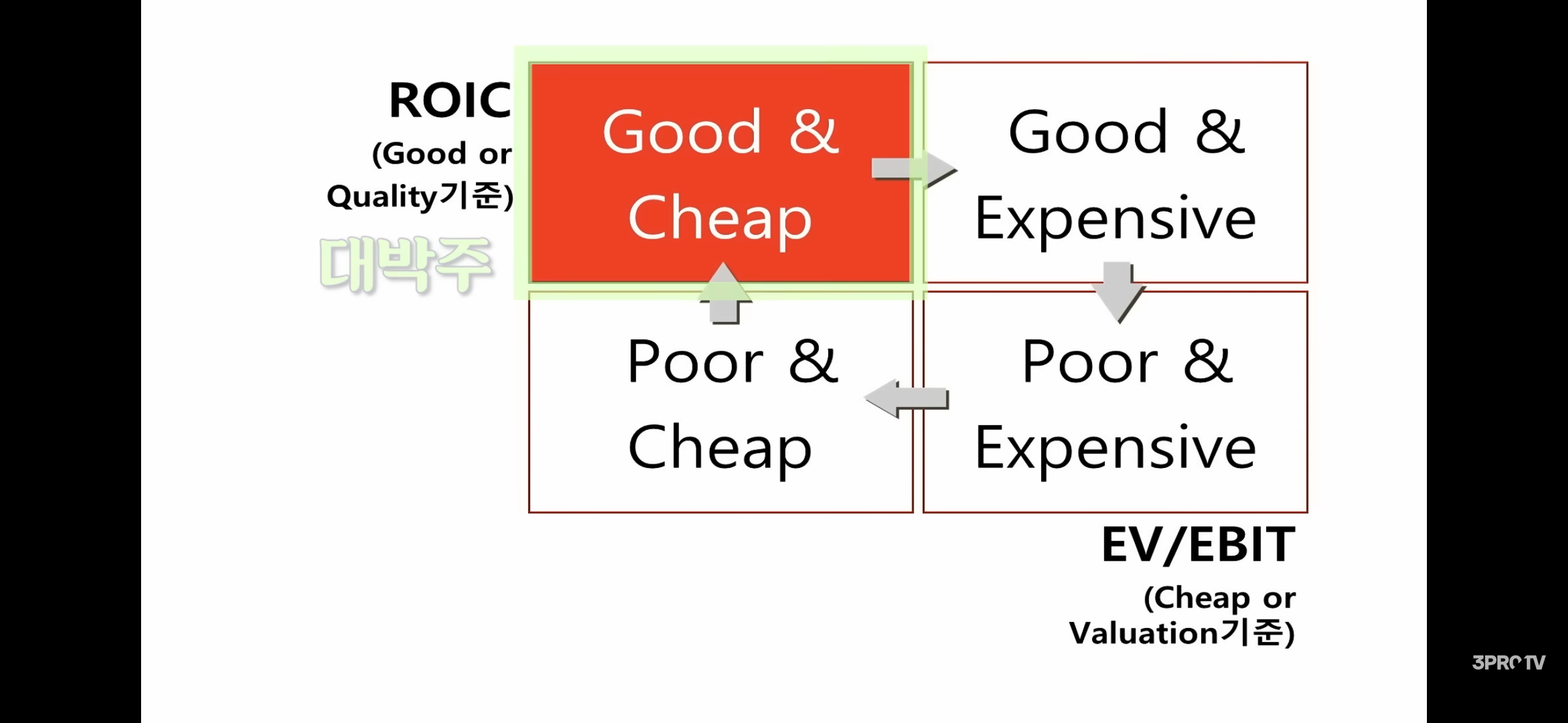 - 미국 주식시장 40년 데이터를 PBR·ROE(또는 ROIC, EV/EBIT 현금창출력) 기준으로 네 영역으로 나누고, PBR이 낮고 수익성이 높은 기업(이 기업은 PER도 낮을 것)을 ‘굿앤칩(대박주)’이라 부른다.